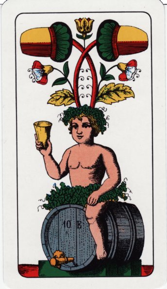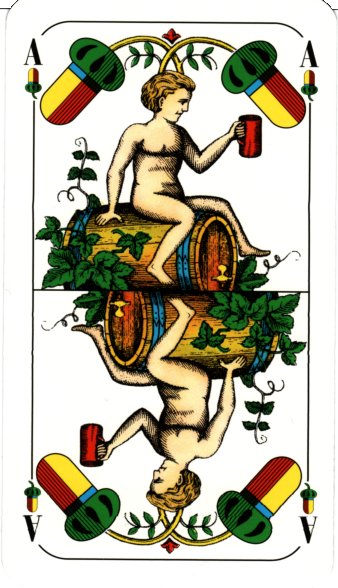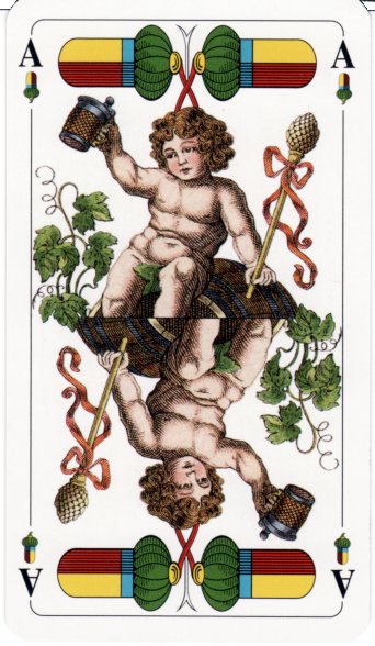The highlights and identifying features of the pattern are the seated kings and the decorative twos or aces (despite having indices “A, the aces clearly have two suit symbols, betraying their origin as twos). The ace of acorns features a naked cherub sitting on a barrel hoisting a tankard, with plants that look like hops. The ace of bells has a dog fighting a boar. The ace of leaves has a decorative cup with roses and the ace of hearts has Amor with his arrow.
