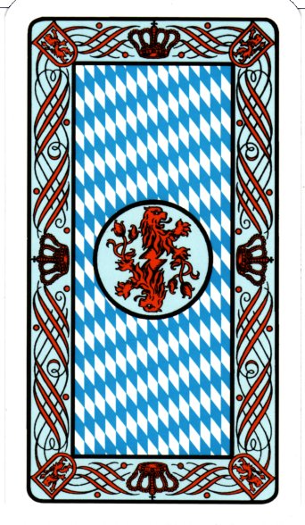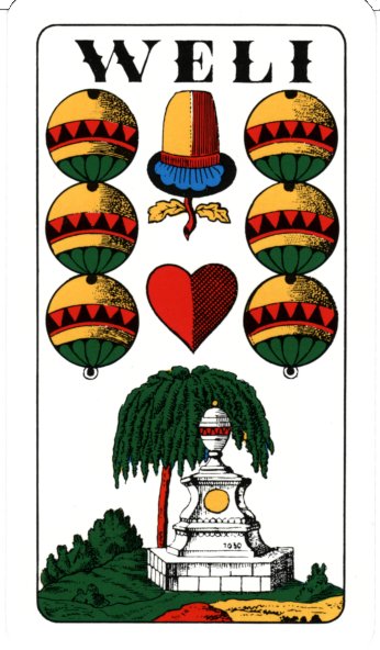 This pack also has a WELI card, that is, the six of bells has a large “WELI” text in the top, an acorn and a heart and a fountain in the bottom. This card is used in some Tyrolean games played with a 33-card pack (number cards 7-10 in every suit and WELI).