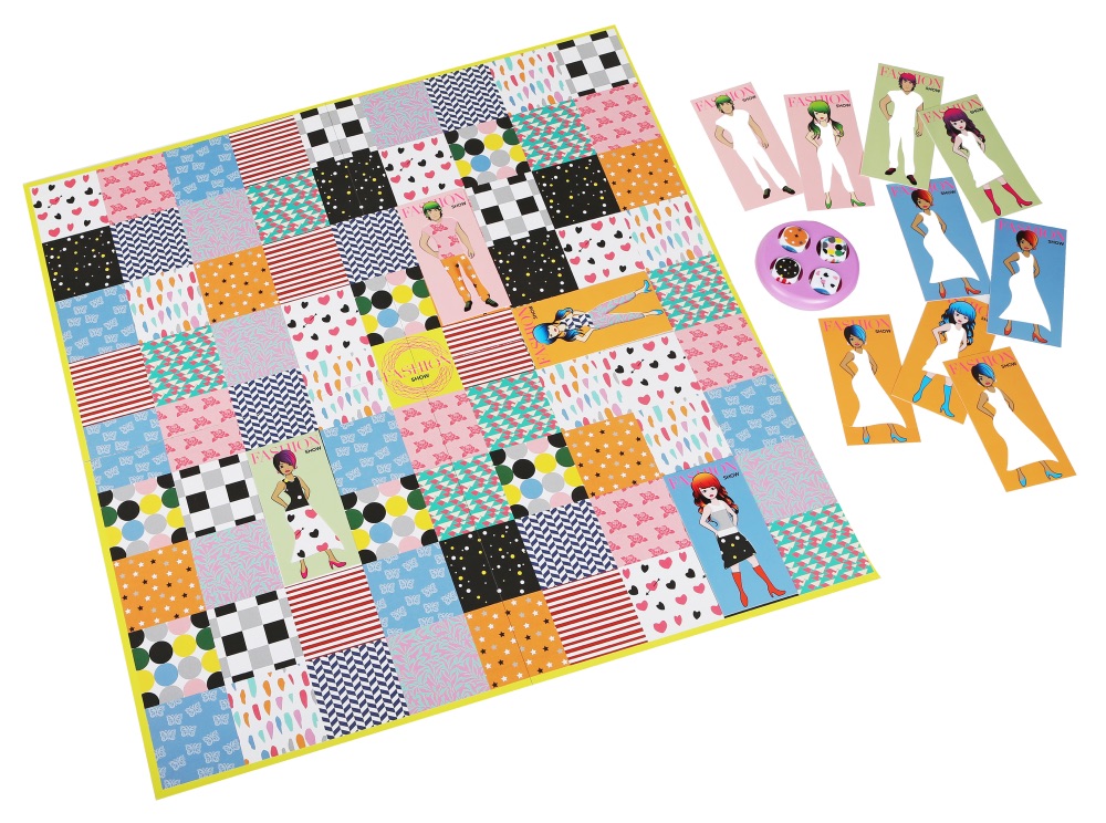 What’s in the box? A large board checkered with different cloth patterns, a bunch of thin cards. The cards have images of girls and boys, with the clothes cut out. When the card is placed on the board, it’ll get clothes from the patterns. There’s also the Style Mixer, a plastic gadget with four dice.
