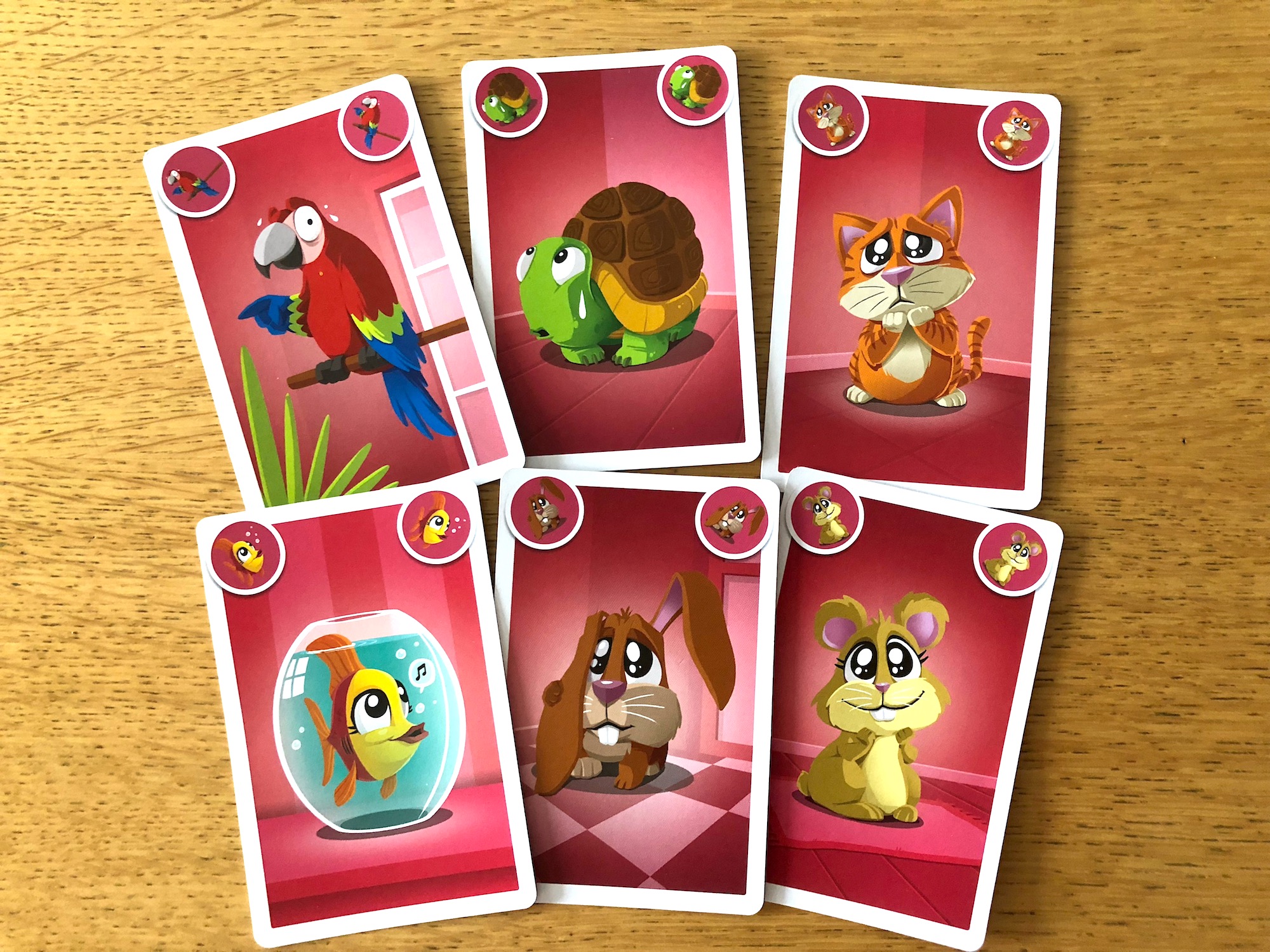 What do you do in the game? Everybody gets six cards with six different animals on them. The youngest player begins by playing a card and declaring, for example, “It wasn’t my parrot; it was the turtle!” which means that now everybody else must rush to play their turtle card on top of the parrot. The first player to do that then declares “It wasn’t my turtle, it was…” and names the next animal.
