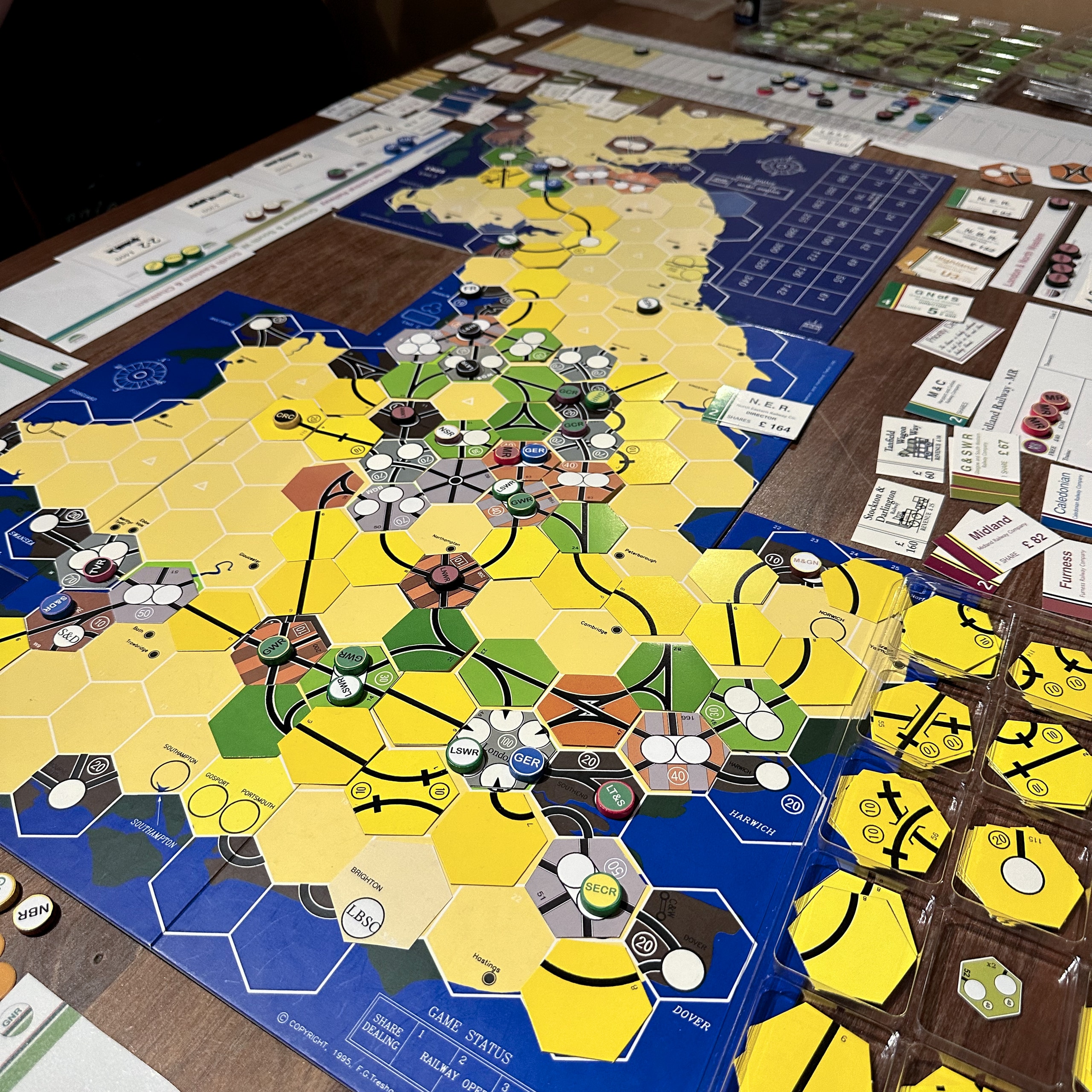 This time, we used 18xx.games as a moderator. This speeded up the game greatly. With the default £16,000 bank, we played ten stock rounds in four and half hours. In total, the game was over in less than five hours including setup and teaching.